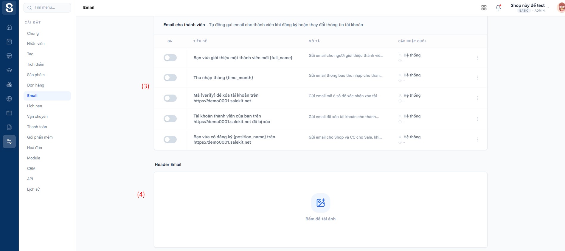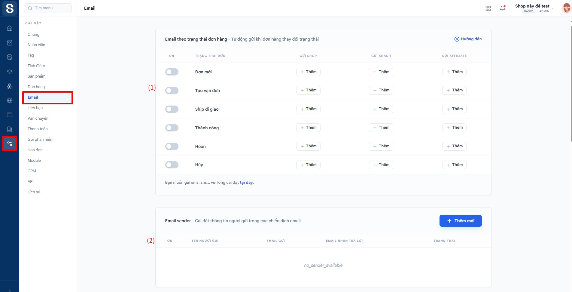 - Mẫu email: Cài đặt nội dung email gửi tới chủ shop hoặc khách với từng trạng thái đơn hàng.