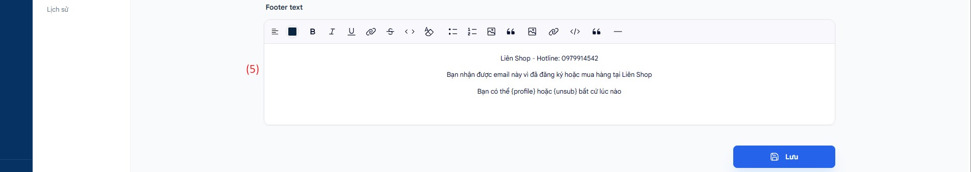 5. Footer Email: Nội dung chân trang hiển thị ở tất cả email. Bạn nhập nội dung footer khi gửi email.