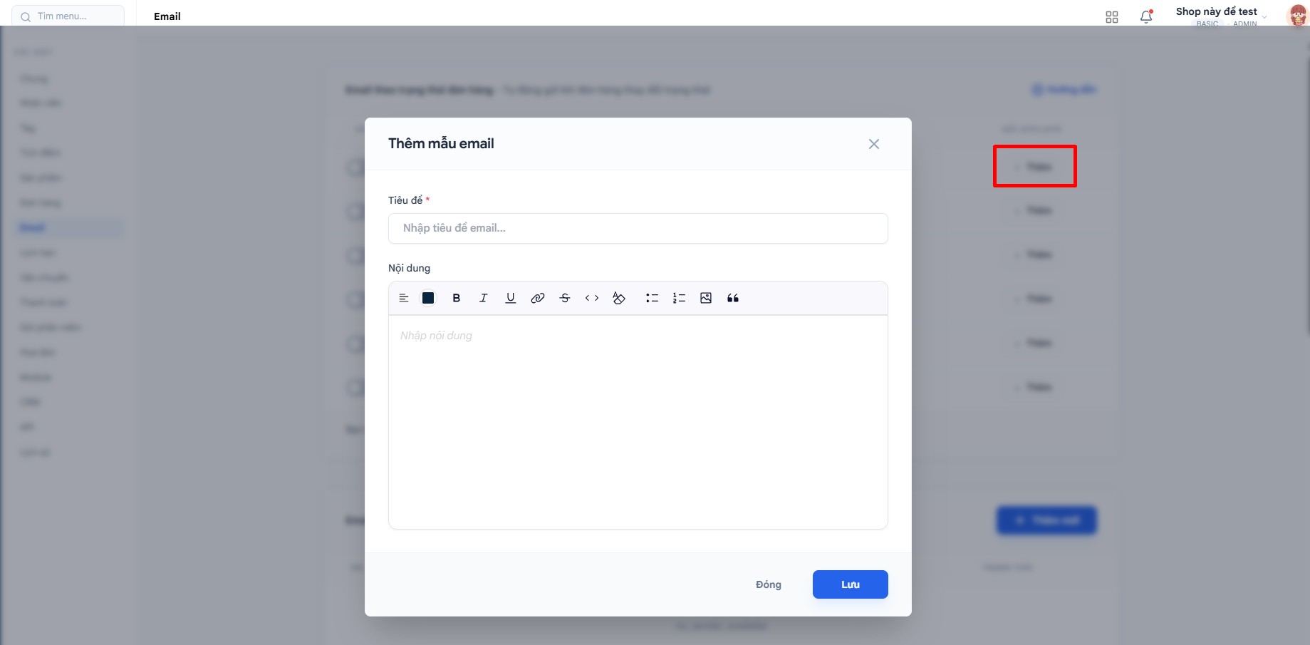 Bạn nhấn +Thêm để thêm nội dung email gửi shop, khách hàng hoặc người giới thiệu >> Lưu >> Trạng thái đơn sẽ được bật tự động: