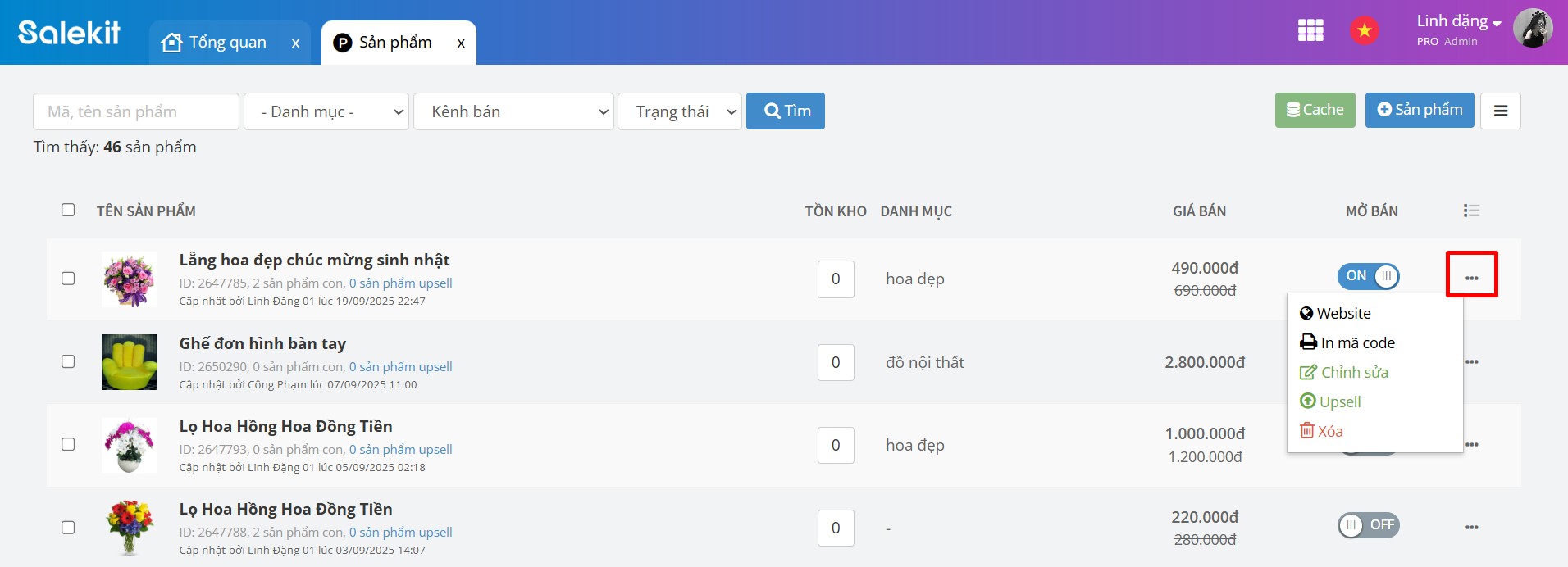 - Bật/tắt mở bán: Chỉ những sản phẩm bật mở bán mới hiện trên website cho khách đặt hàng.